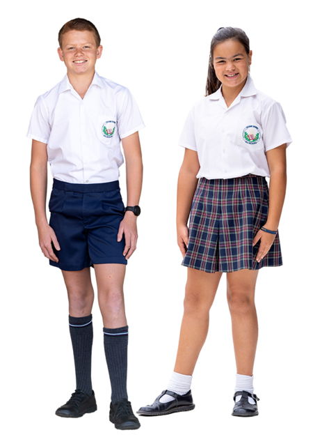 Seuns: Wit hemp met wapen, seuns blou kortbroek, grys kouse en swart skoene.