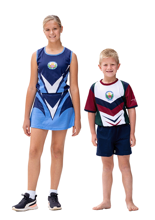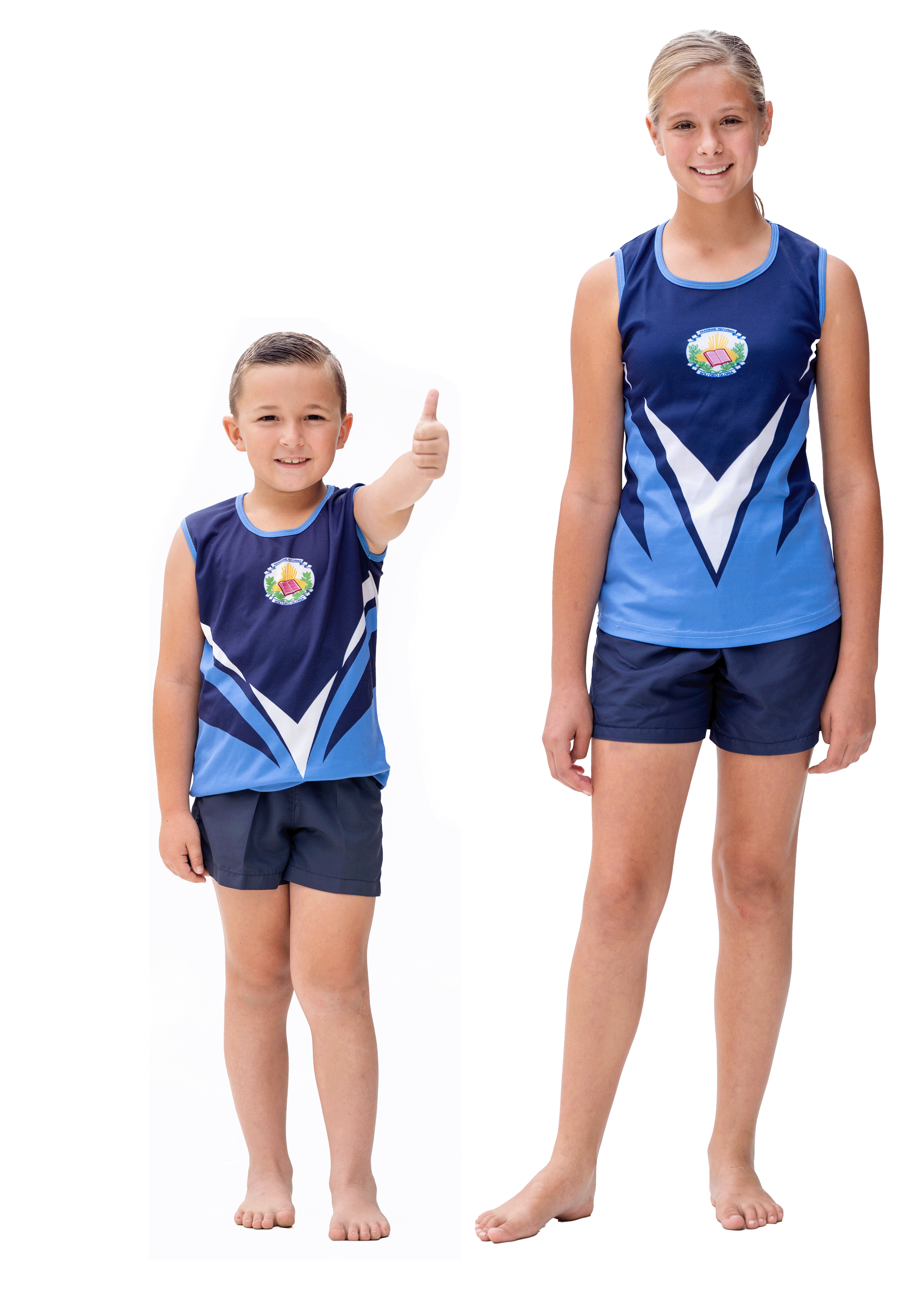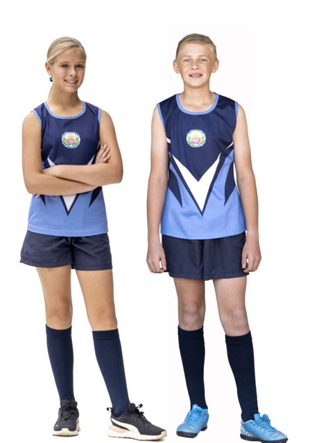 Dogters: Blou sporthemp met blou kortbroek of netbalrompie.